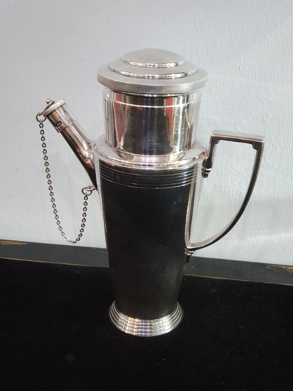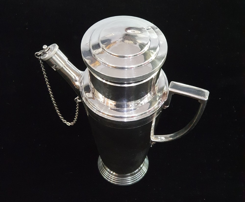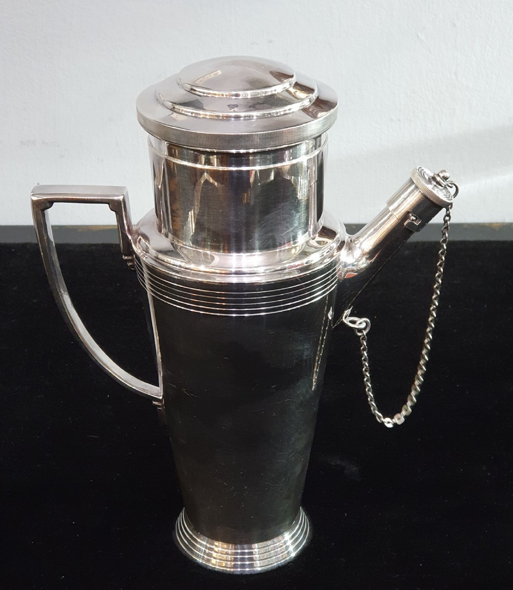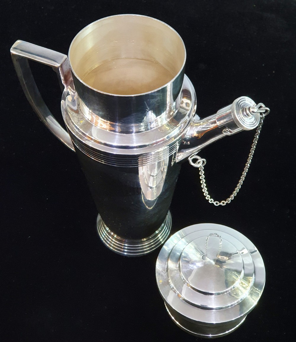 Mappin & Webb, Keith Murray design, Art Deco silver plated cocktail shaker c1930. Signed to the underside. Height: 22cm Width: 19cm Depth: 10cm Condition: excellent. __________________________________ To buy this item please click on the "BUY NOW with CREDIT CARD or PAYPAL" button underneath the Item Ref or phone the shop on 07903 740299. __________________________________ We offer a ring resize service. Typical cost £40. __________________________________ We offer a next day recorded postal service on most items with insurance and tracking. Please enquire. __________________________________ We accept all forms of payment - payment over the phone, bank transfer, all major credit & debit cards. We can place items on reserve subject to a 10% deposit. Deposits are non refundable. __________________________________ We ship worldwide. Shipping to U.S.A, Canada, Australia, UAE. Africa & Europe. Please contact me about postage as prices vary. __________________________________ Layaway plan. We offer an option of paying for your goods in instalments, taking delivery upon payment of final instalment. Please enquire for details. __________________________________ Established over 30 years, buy with confidence from a physical shop with an online presence. We offer the most comprehensive luxury and deco goods range in the Cotswolds and we are adding new lines all the time, and will not be beaten on price. ___________________________________ Do not hesitate to contact us with any questions and we will be glad to answer you as quickly as possible.: andy.green007@btinternet.com, Mobile 07903740299/ +447903740299 Whatsapp +447903740299 ___________________________________ Terms & Conditions for online purchases: If for any reason you are not entirely satisfied with your purchase, please return the item in its original packaging within 14 days of purchase. Buyer to pay the return postage. A handling charge/ restocking fee to cover administration and transport costs may be applied. Unfortunately we are not able to offer a refund on earrings but we may be able to offer an exchange or gift voucher. ___________________________________ Internal Ref: 140421